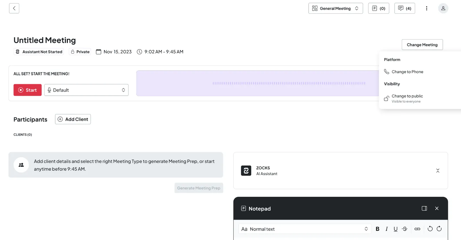 - Personal phone: Call Zocks to add the AI Meeting Assistant to ongoing calls. If you have a calendar event within ±10 minutes, you'll be prompted to link your call to your scheduled event, or you can keep it separate for ad-hoc conversations