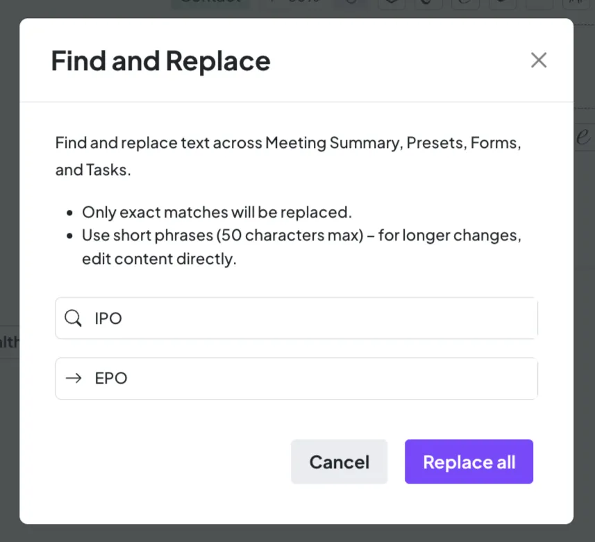Whether you prefer AI-assisted editing or direct find-and-replace control, you can quickly polish meeting documentation without worrying about unintended changes to your content. Updates apply across meeting summary, all presets, tasks, and meeting titles.