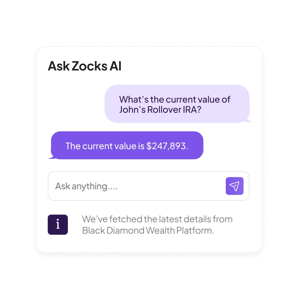 Zocks does it in seconds. Connect Black Diamond and your other systems, and Zocks automatically assembles a one-page brief — portfolio values, holdings, account details, and client context — before you walk in.