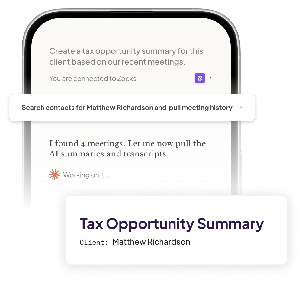 Zocks MCP connects your client intelligence to Claude, ChatGPT, and other AI tools. For the first time, advisors can produce truly personalized client-ready deliverables and insights at scale.